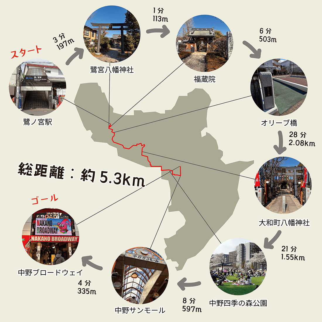 | コース概要 | 出発地点は鷺ノ宮駅そばの鷺宮八幡神社、妙正寺川を下って中野の名スポットを巡りながら中野駅方面へ、最後はブロードウェイやサンモールでお買い物や食事も楽しめる欲張りコースです。 |