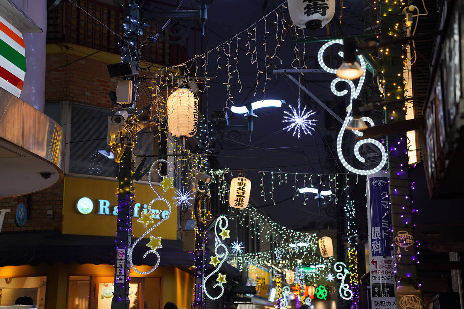 駅前から中野ブロードウェイへと続くサンモール商店街や細かく横の裏路地に延びる商店街は、12月になるとクリスマスシーズンらしい華やかな照明で彩られます。街路灯や店舗のネオン看板、赤ちょうちんの街灯と調和して他の地域にない独自の世界をつくっています。各商店街が工夫を凝らし、頭上や電柱にイルミネーションを施し、買い物を楽しむ人や通行人の目を楽しませています。