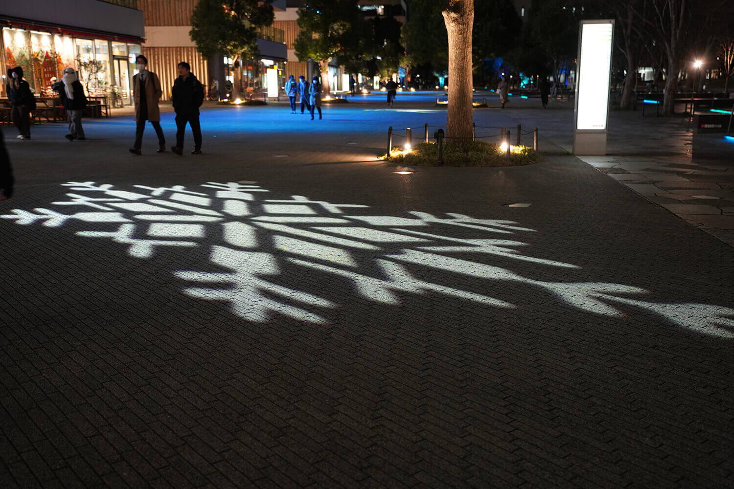 光の演出をさらに楽しむには、特定の時間(例年17:00~23:00の間の00分、20分、40分からの5分間)に、クリスマスのモチーフが地面に浮かび上がる特別な演出もありますので、時間を合わせて訪れるのがおすすめです。