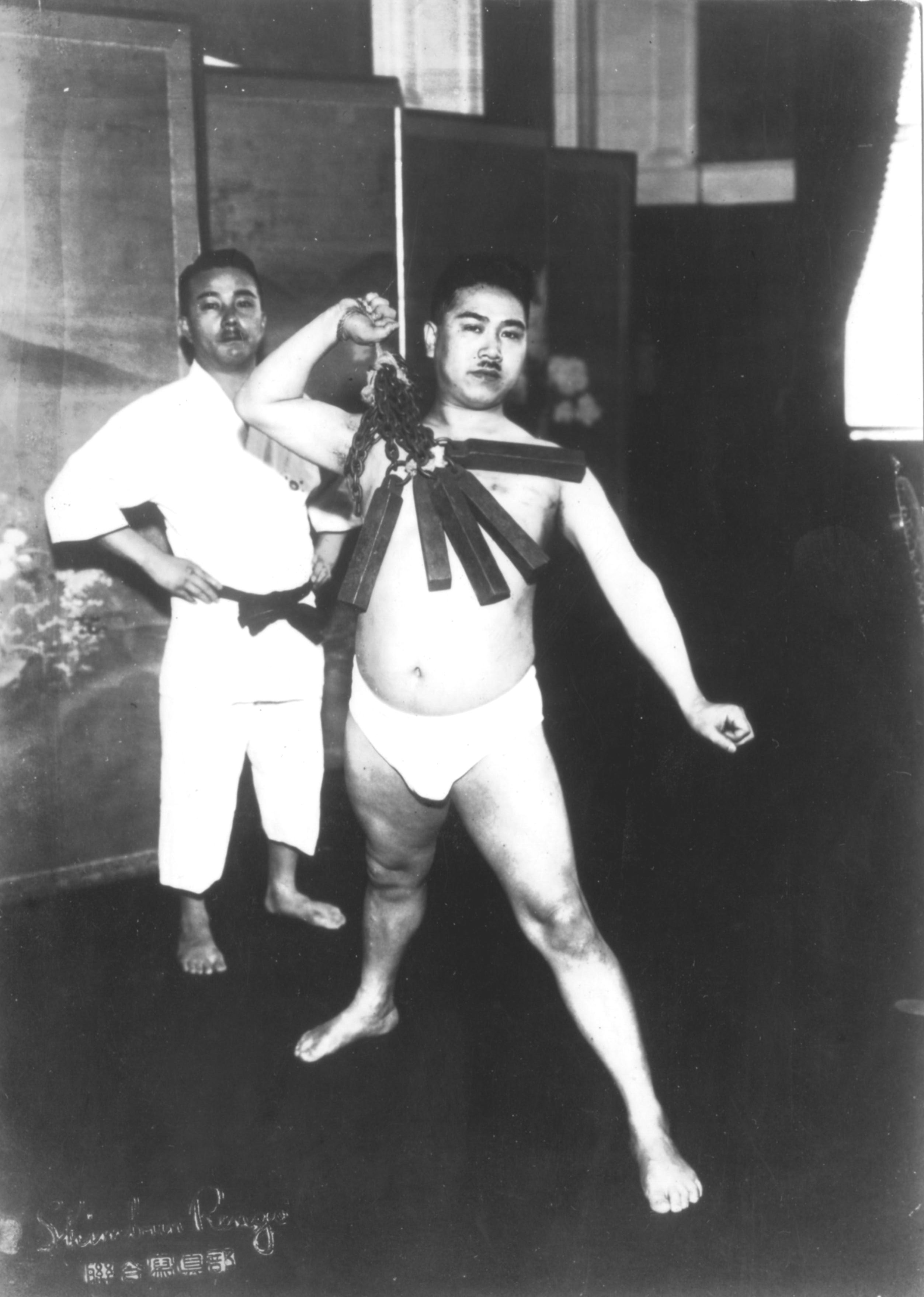 「血のにじむ体力練磨 なお忍術者は、敵にとらえられて持間にかけられる場合も多いと考えなければならぬが、そんなことで音をあげてしまっては、忍者としての使命が果せるものではないから、大概のことには平気で耐えられるように、そのためには日頃からずいぶん思い切つた練習をする。その一つとして私が試みたのは、身体に針を刺すことで、これは畳針大のものを顔面から耳、舌、全身へ五百本も刺したレコードがある。とても痛くて苦しいことのようだが、思い切つてしまうと何でもなく平気でやれる。舌に針を刺したまま、人と話をするぐらいは造作ないことである。また、五体を強健にする特殊の練方法としては、八貫匁(約三〇キログラム)から十五、六貫くらいの鋼鉄の分鍋を振って、自分の胸部を打つこともある。私は十八、九歳くらいの時から、これは二十年以上、毎日のように続けたものだ。」