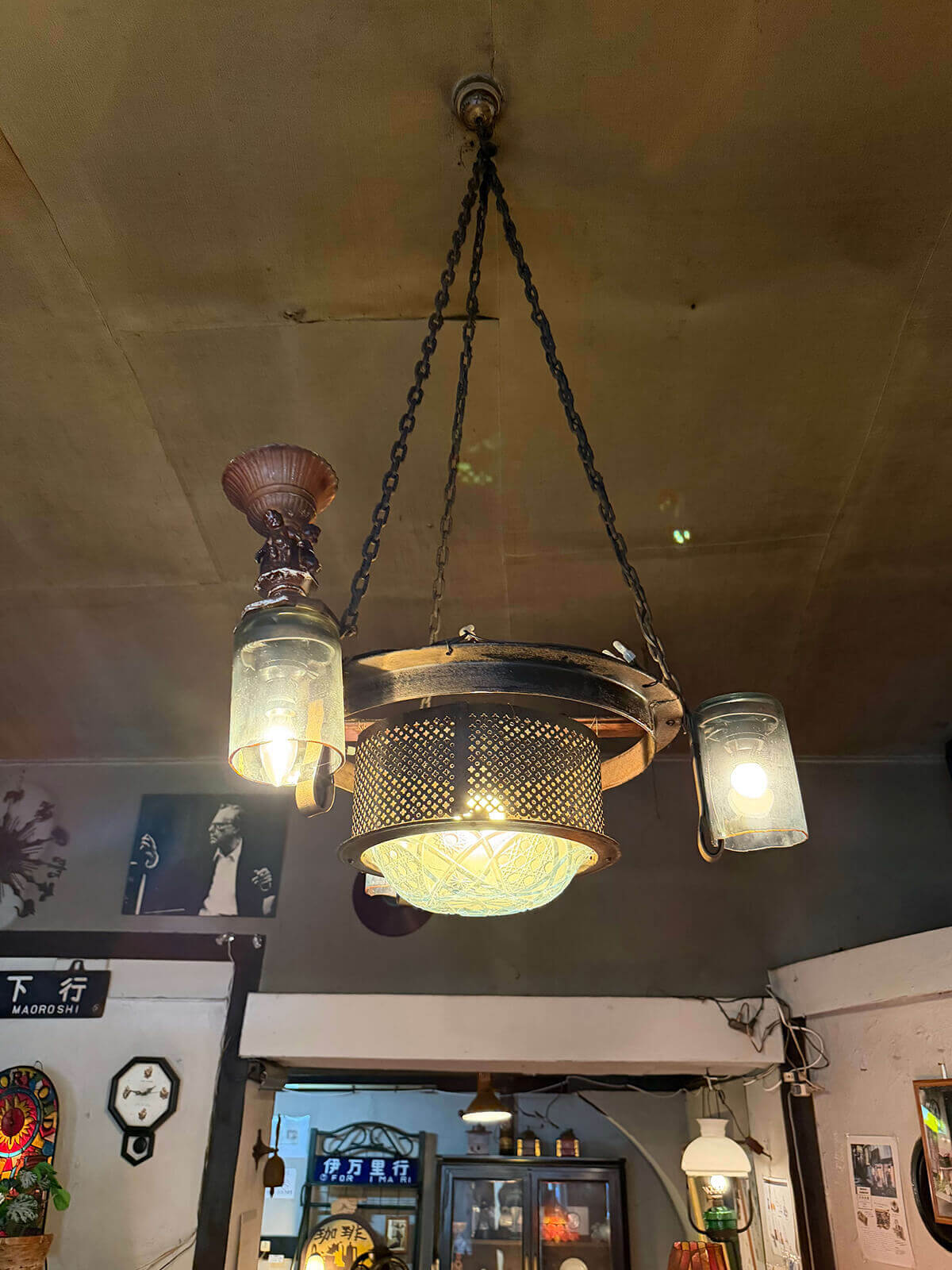 この店と中野には、ひとつの縁がある。内装のデザインを手がけたのは、クラシックの創業者・美作七郎だった。フルーツ皿と一升瓶の底で作ったシャンデリア、洗面器を使って作ったランプシェードなどは開店当時のまま、今も店内に残っている。やはりクラシックに縁のある阿佐ヶ谷の「名曲喫茶ヴィオロン」寺本さんにお話を聞いたところ、一升瓶を切る作業を寺本さん自身が手伝ったという。外の黄色に黒文字の看板デザインも、中野のクラシックに倣ったものらしい。