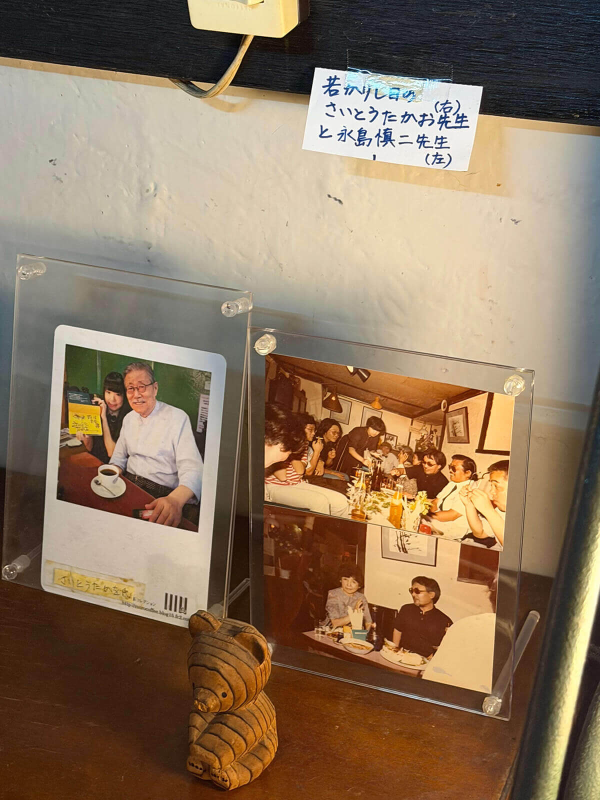 店内には漫画家・永島慎二の写真も飾られている。永島慎二はかつてでんえんに毎日のように通い、ここで働いていたウェイトレスと結婚した。代表作『漫画家残酷物語』にでんえんを登場させたとも言われる。さいとう・たかをのゴルゴのフィギュアもある。「多分さいとうたかお先生からもらったんだと思う」と娘さんは言う。当時、でんえんは漫画家たちのたまり場でもあったのだ。