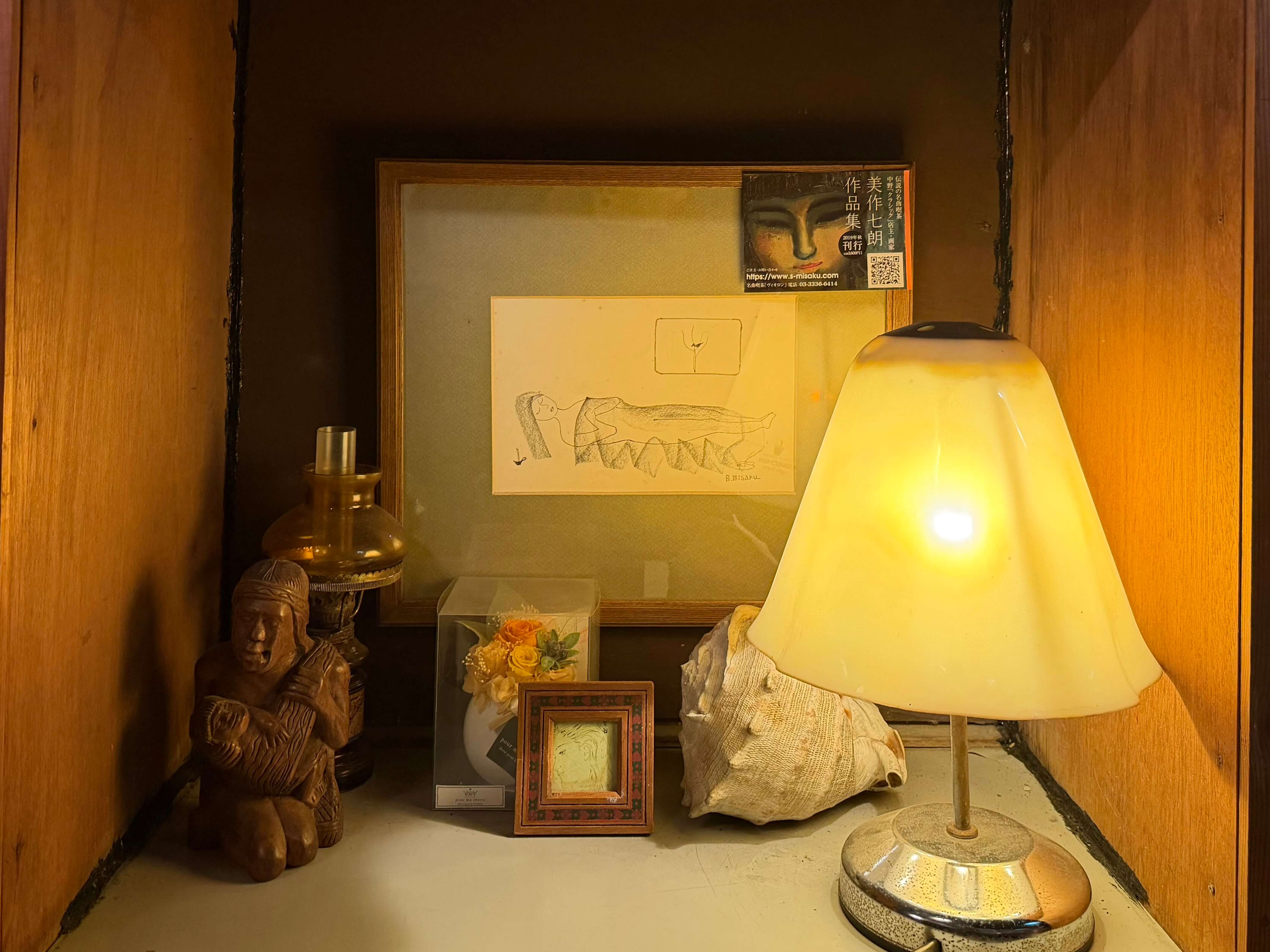 入口脇の看板には「クラシックと絵 でんえん」と記されている。音楽だけでなく、絵の展示もこの店のもうひとつの顔だった。近隣の武蔵野美術大学などの学生たちの作品展が開かれ、若い表現者たちを迎えてきた。