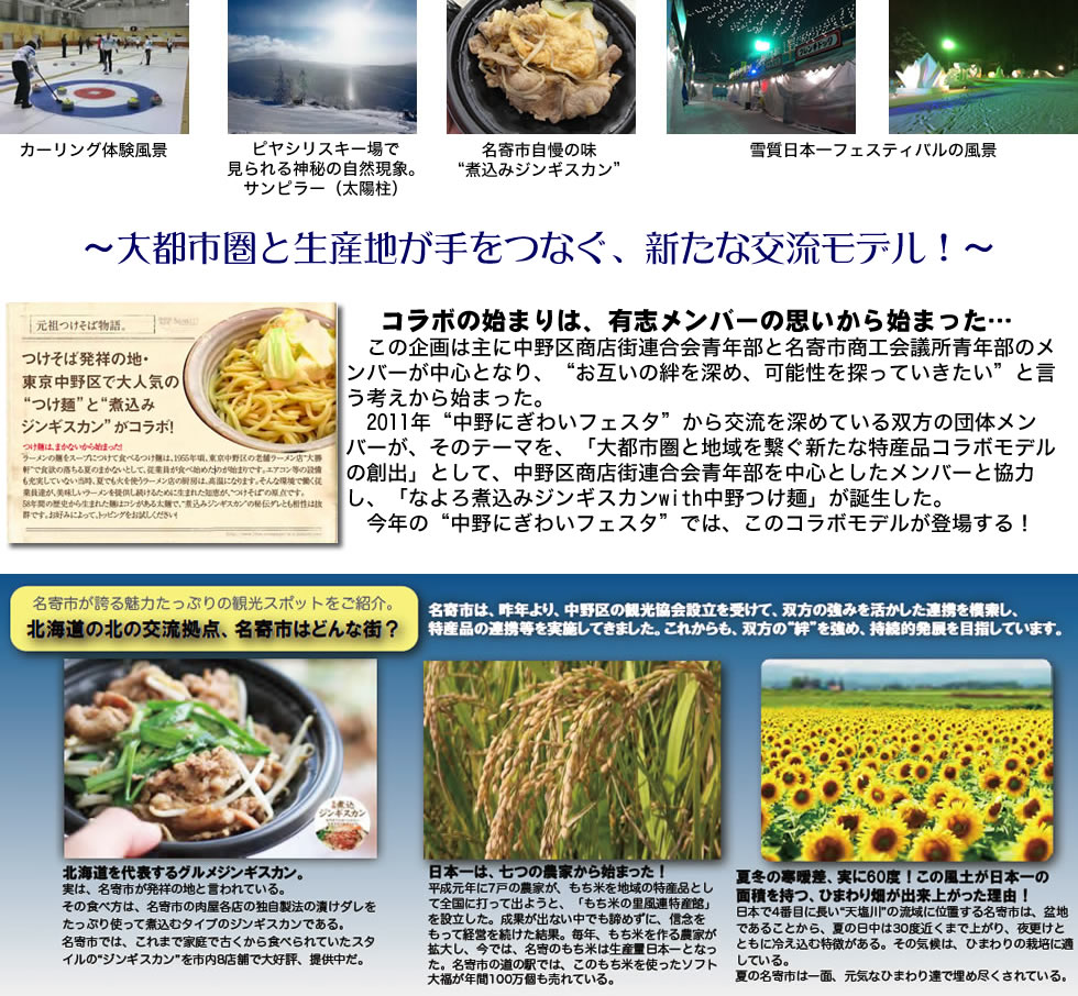 また、四季の森公園会場に出店している名寄テントでは名寄名物煮込みジンギスカンと中野区のつけ麺がコラボした